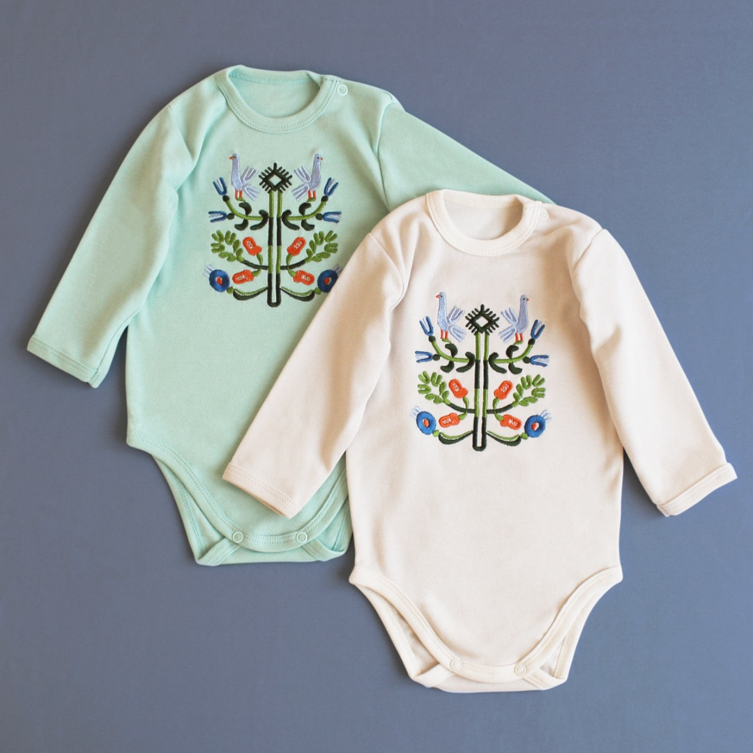Оригінальний дизайн для перших місяців життя — боді з довгим рукавом, оздоблені авторською вишивкою у народному стилі.