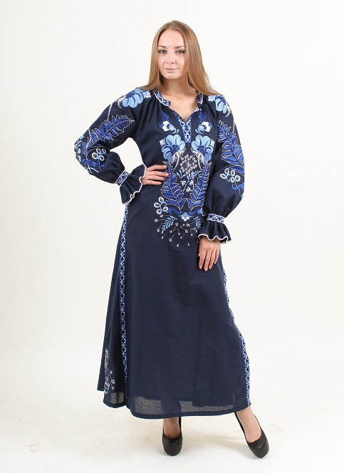 Ця сукня поєднує в собі елегантність темно-синього кольору з яскравою вишивкою гладдю у відтінках синього і білого. Ретельно вишиті квіткові мотиви прикрашають груди, рукави та боки, створюючи відчуття витонченості та національного стилю.