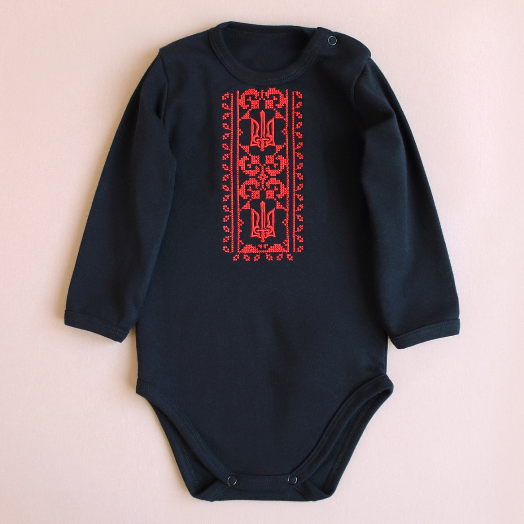 Патріотичний образ для найменших — чорне боді з вишитим тризубом і стилізованими мечами стане особливим елементом гардеробу до свят чи фотосесій. Ефектне поєднання чорного фону й червоної вишивки влучно передає український дух.