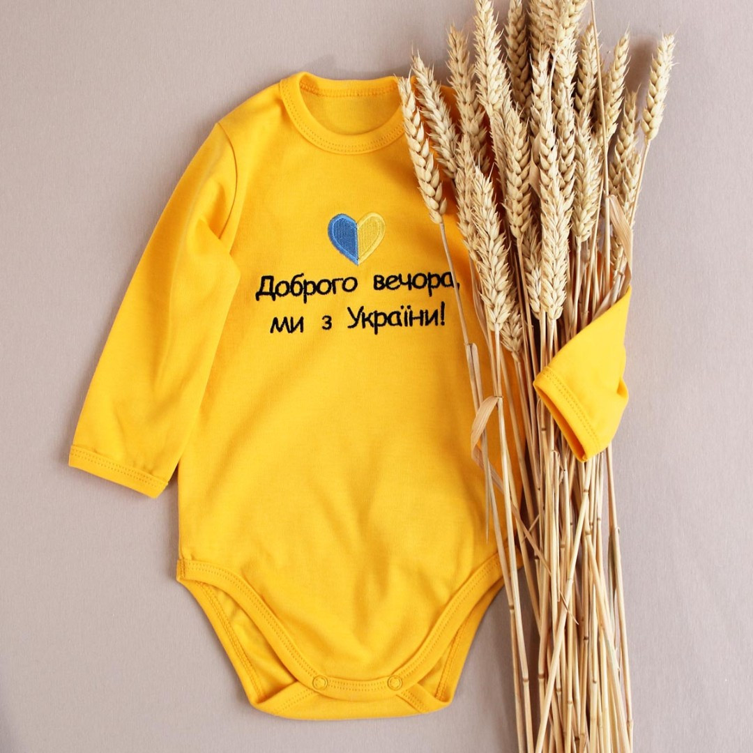 Жовтий боді з довгим рукавом прикрашений символічною вишивкою: синьо-жовте серце та фраза "Доброго вечора, ми з України!". Ідеальний вибір для патріотичних родин, які з дитинства хочуть прищепити любов до Батьківщини.