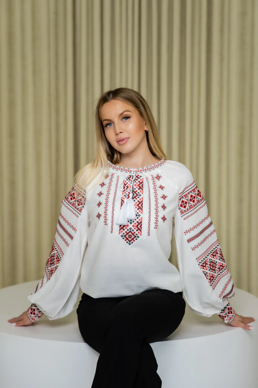 Ніжно молочна традиційна жіноча вишиванка з етноорнаментом червоного кольору довгі рукави хрестик